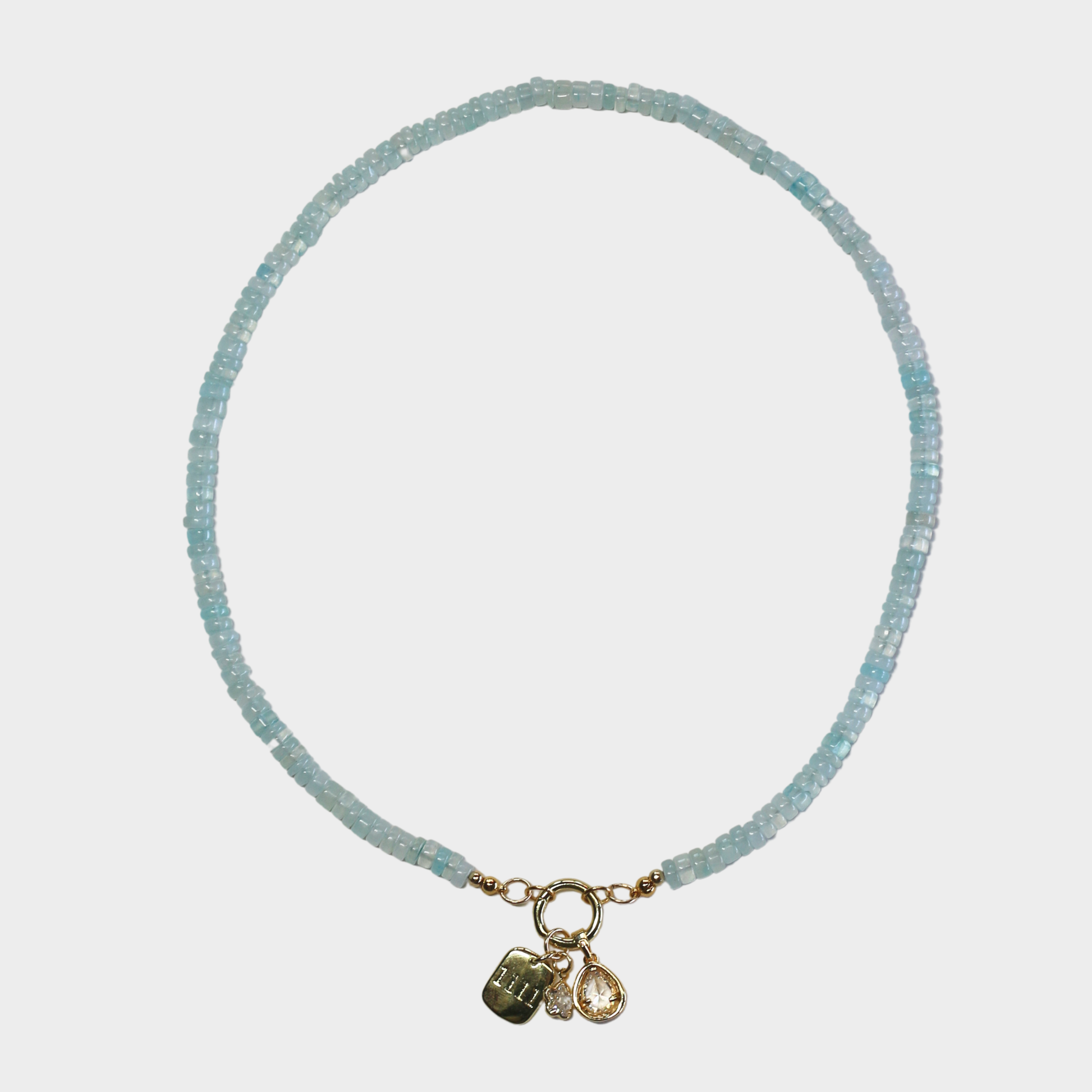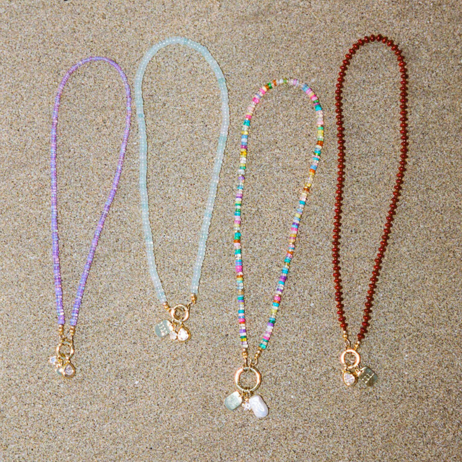 You're a star bb. Semi-precious gemstone strand adorned with a curated mix of gold-filled charms. Charm combinations vary by piece and may include symbols such as hearts, stars, angel numbers, and mother of pearl, making each Star bb completely one of a kind. Just like you!